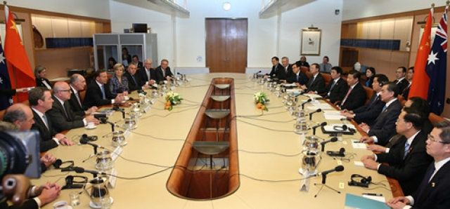 ????【畫面】澳大利亞議會大廈“總理庭院”里陽光明媚,習(xí)近平主席和阿博特總理的手再次緊緊握在一起。兩國領(lǐng)導(dǎo)人隨后一個多小時的會談產(chǎn)生兩項重大成果:決定將中澳關(guān)系提升為全面戰(zhàn)略伙伴關(guān)系,宣布實質(zhì)性結(jié)束中澳自由貿(mào)易協(xié)定談判。