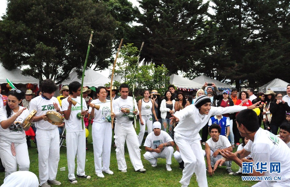 ????巴西青年表演了巴西傳統(tǒng)戰(zhàn)舞。(新華網(wǎng)記者 梁君茜 攝)