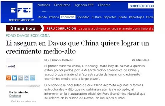22日,西班牙埃菲社報(bào)道了李克強(qiáng)總理在達(dá)沃斯世界經(jīng)濟(jì)論壇上的致辭,特別提到他就中國(guó)經(jīng)濟(jì)增速放緩的回應(yīng)。報(bào)道中引用李克強(qiáng)總理的話:“中國(guó)經(jīng)濟(jì)進(jìn)入新常態(tài),經(jīng)濟(jì)由高速增長(zhǎng)轉(zhuǎn)為中高速增長(zhǎng)。發(fā)展則必須由中低端水平邁向中高端水平,為此要堅(jiān)定不移地推動(dòng)結(jié)構(gòu)性改革?!?/p>