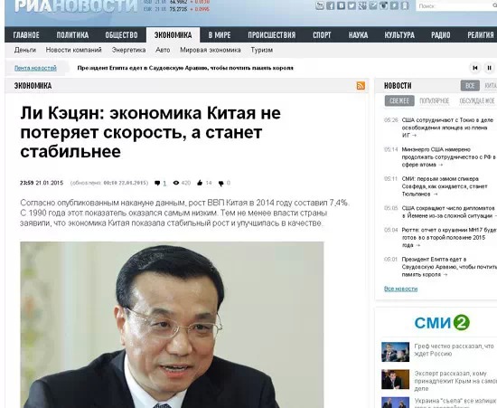 俄新社以一篇題為《中國(guó)經(jīng)濟(jì)不會(huì)失速,而會(huì)更加穩(wěn)定》的文章,報(bào)道了中國(guó)經(jīng)濟(jì)的發(fā)展前景。文中稱(chēng),2014年中國(guó)經(jīng)濟(jì)發(fā)展速度是7.4%,這是1990年以來(lái)的一個(gè)低點(diǎn),但中國(guó)經(jīng)濟(jì)的發(fā)展正在體現(xiàn)“新常態(tài)”,即體現(xiàn)在質(zhì)的提升。