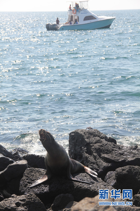 一只海獅在圣克里斯托巴(San Cristobal)島海邊的礁石上發(fā)出低叫,不遠處有輪船駛過。