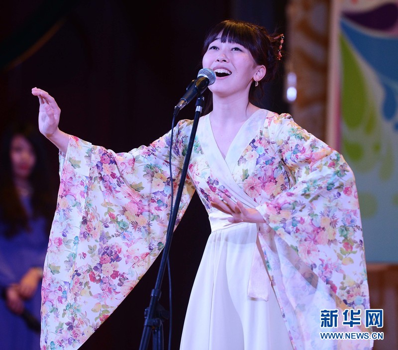 4月28日,在烏內(nèi)務(wù)部文化宮禮堂活動現(xiàn)場,塔什干孔子學(xué)院的ARUXAN(中文名:阿魯)在參加比賽。新華網(wǎng)記者 沙達(dá)提攝