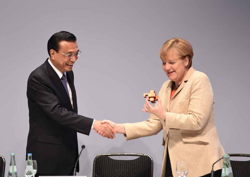 2014年10月10日,國務(wù)院總理李克強在柏林與德國總理默克爾共同出席第七屆中德經(jīng)濟技術(shù)合作論壇。這是在論壇上,李克強總理將一精巧的魯班鎖送給默克爾。(新華社記者李學(xué)仁攝)