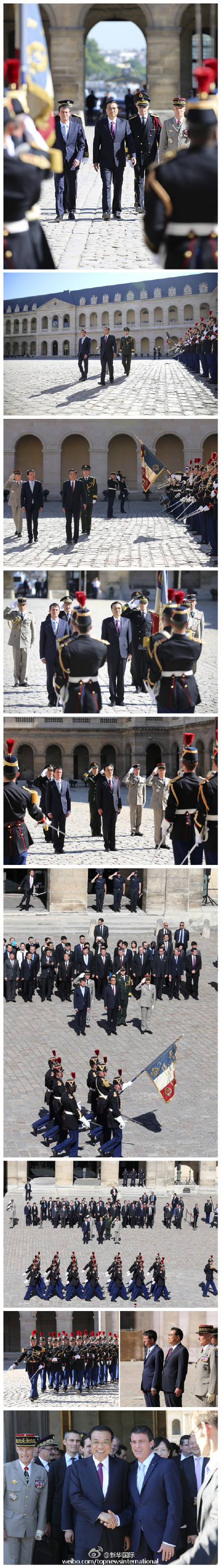 新華網(wǎng)北京7月1日電 據(jù)新華社“新華國(guó)際”微博報(bào)道,當(dāng)?shù)貢r(shí)間30日上午,法國(guó)總理瓦爾斯在榮軍院舉行隆重儀式,歡迎李克強(qiáng)總理訪法。明媚的陽(yáng)光下,50人方陣的軍樂隊(duì)高奏中法兩國(guó)國(guó)歌,雄壯的《義勇軍進(jìn)行曲》和激昂的《馬賽曲》響徹榮軍院上空。隨后,儀仗隊(duì)舉行分列式,接受中國(guó)總理李克強(qiáng)的檢閱。