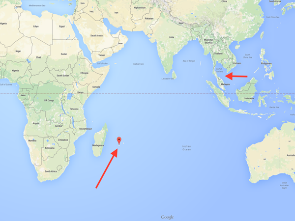 (左側箭頭是殘骸發(fā)現(xiàn)地,右側為MH370最后信號的發(fā)出地)