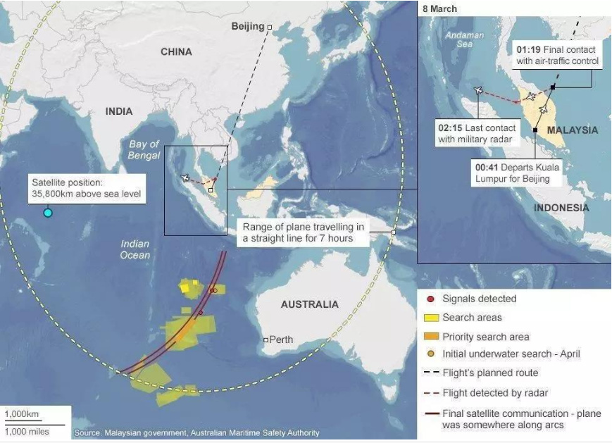 許多人還記得,MH370失去聯系后,根據飛機曾與衛(wèi)星聯系的信號在印度洋東部劃出了一個12萬平方公里的搜尋區(qū),那為什么現在殘骸又出現在了數千公里外、印度洋西南部的留尼汪島?