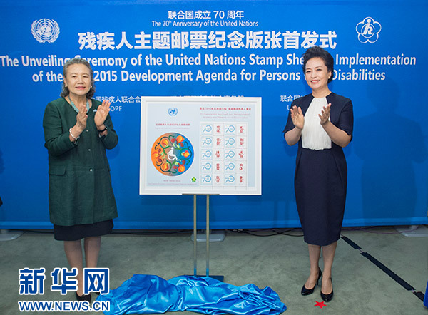 新華網(wǎng)聯(lián)合國9月27日電(記者霍小光)當(dāng)?shù)貢r間27日上午,國家主席習(xí)近平夫人彭麗媛在紐約出席殘疾人主題郵票紀(jì)念版張首發(fā)式。彭麗媛同聯(lián)合國秘書長潘基文夫人柳淳澤一道為紀(jì)念版張揭幕。
