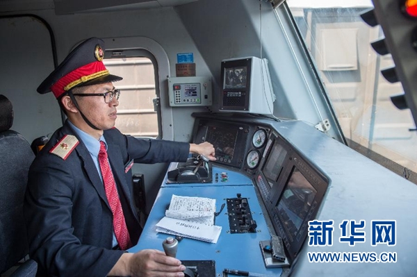 10月15日,第1000列中歐班列開行前,重慶機務段執(zhí)行本次班列駕駛任務的司機王銘杰在駕駛室內進行開行前的操作。當日11時45分,載著筆記本電腦等51個集裝箱貨物的中歐班列,緩緩駛出重慶團結村站,駛向1.1萬公里之外的德國杜伊斯堡。這是第1000列往來中國和歐洲之間的國際貨運列車。新華社記者劉潺攝