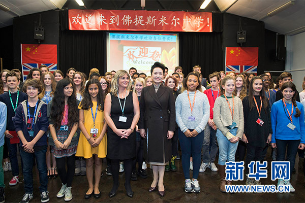 ??? 10月21日,國(guó)家主席習(xí)近平夫人彭麗媛在倫敦參觀福提斯米爾中學(xué)。這是彭麗媛同該校學(xué)生合影。 新華社記者 謝環(huán)馳 攝