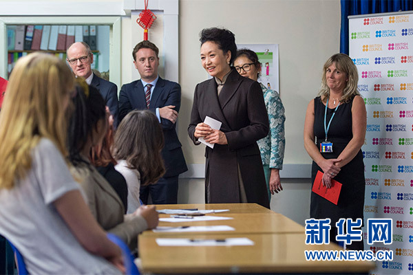 在英國(guó)教育部國(guó)務(wù)大臣吉布、學(xué)校校長(zhǎng)等陪同下,彭麗媛觀看學(xué)生們用中文進(jìn)行的才藝表演,參觀學(xué)校成果展,觀摩中文課,與女學(xué)生們互動(dòng)交流,并向?qū)W校贈(zèng)送中國(guó)文化及漢語學(xué)習(xí)類圖書及音像制品。