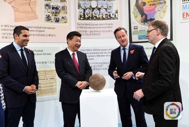 10月23日,國(guó)家主席習(xí)近平在英國(guó)首相卡梅倫陪同下,參觀曼徹斯特城市足球?qū)W院。新華社記者 饒愛(ài)民 攝