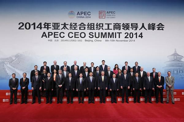 2014年11月9日,國家主席習近平同與會亞太工商界代表合影。