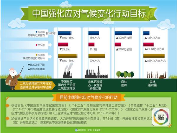 今年6月,中國正式向聯(lián)合國提交2020年后應(yīng)對(duì)氣候變化的“國家自主決定貢獻(xiàn)”:二氧化碳排放2030年左右達(dá)到峰值并爭(zhēng)取盡早實(shí)現(xiàn),單位國內(nèi)生產(chǎn)總值二氧化碳排放比2005年下降60%至65%,非化石能源占一次能源消費(fèi)比重達(dá)到20%左右,森林蓄積量比2005年增加45億立方米左右。