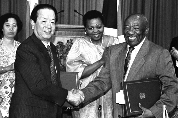 1997年12月30日,中國(guó)與南非簽署建交聯(lián)合公報(bào)。圖為錢其琛與恩佐交換文本后握手。(新華社記者李學(xué)仁攝)