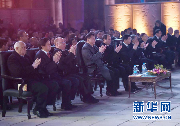 1月21日,國家主席習(xí)近平和埃及總統(tǒng)塞西在古老的盧克索神廟廣場共同出席中埃建交60周年慶?;顒郁?016中埃文化年開幕式。新華社記者張鐸攝