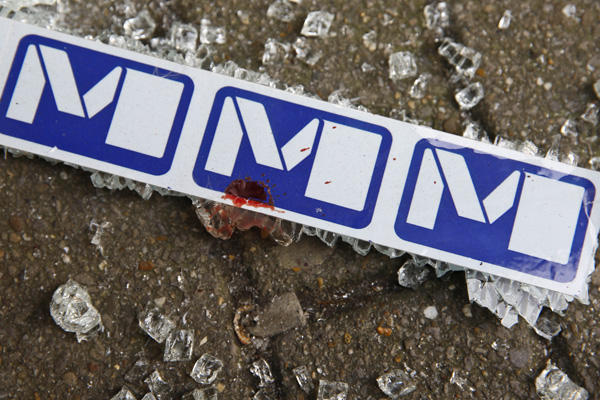 圖為3月22日在比利時首都布魯塞爾馬埃勒貝克地鐵站一個出口處拍攝的沾有血滴的地鐵標志。新華社記者葉平凡攝