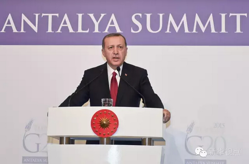??? 2015年11月,G20峰會(huì)在土耳其安塔利亞舉行,從安塔利亞到杭州,從地中海岸到錢塘江畔,與東道主接力棒一樣順利傳遞的,是對(duì)推動(dòng)全球經(jīng)濟(jì)穩(wěn)步復(fù)蘇、實(shí)現(xiàn)可持續(xù)增長(zhǎng)的決心。“接棒”后的中國(guó),在議題設(shè)置上既汲取了安塔利亞峰會(huì)的智慧成果,又著眼當(dāng)前、旨在長(zhǎng)遠(yuǎn)、彰顯新意。 2015年G20安塔利亞峰會(huì)上的埃爾多安總統(tǒng)↓