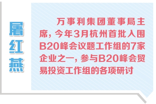 屠紅燕說,中國企業(yè)在“走出去”的過程中代表的不僅是自己,更代表中國形象。此次,站在家門口的B20峰會講臺上,中國企業(yè)希望能站在全球高度參與國際規(guī)則制定,“走出去”能有更公平、便利的政策環(huán)境。
