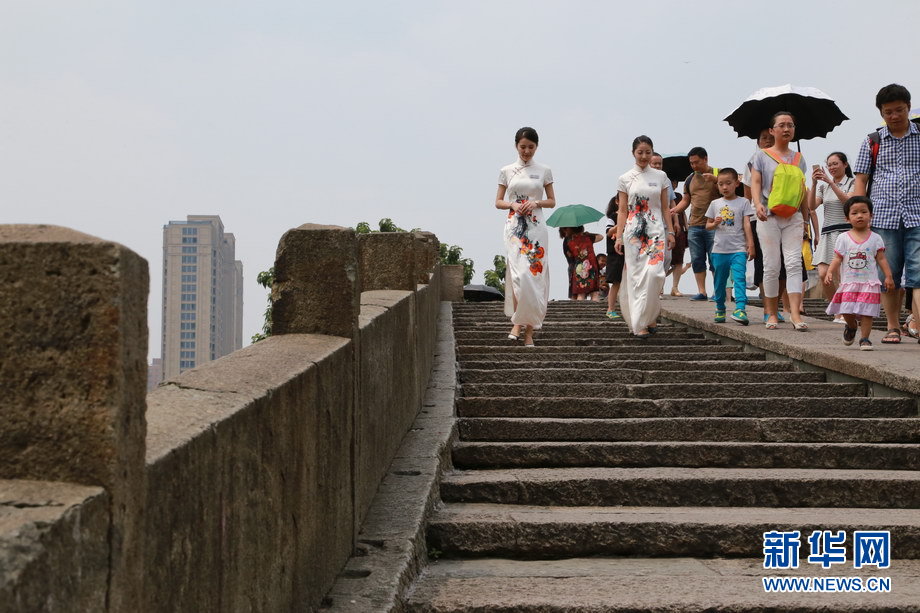 ????拱宸橋面上徐徐走來(lái)的姑娘是本次G20杭州峰會(huì)的志愿者。栩栩如生的杭州刺繡,搭配姑娘優(yōu)雅大方的儀態(tài),加之中英文雙語(yǔ)的精彩講解,讓中外游客印象深刻。新華網(wǎng) 翁 璟 攝