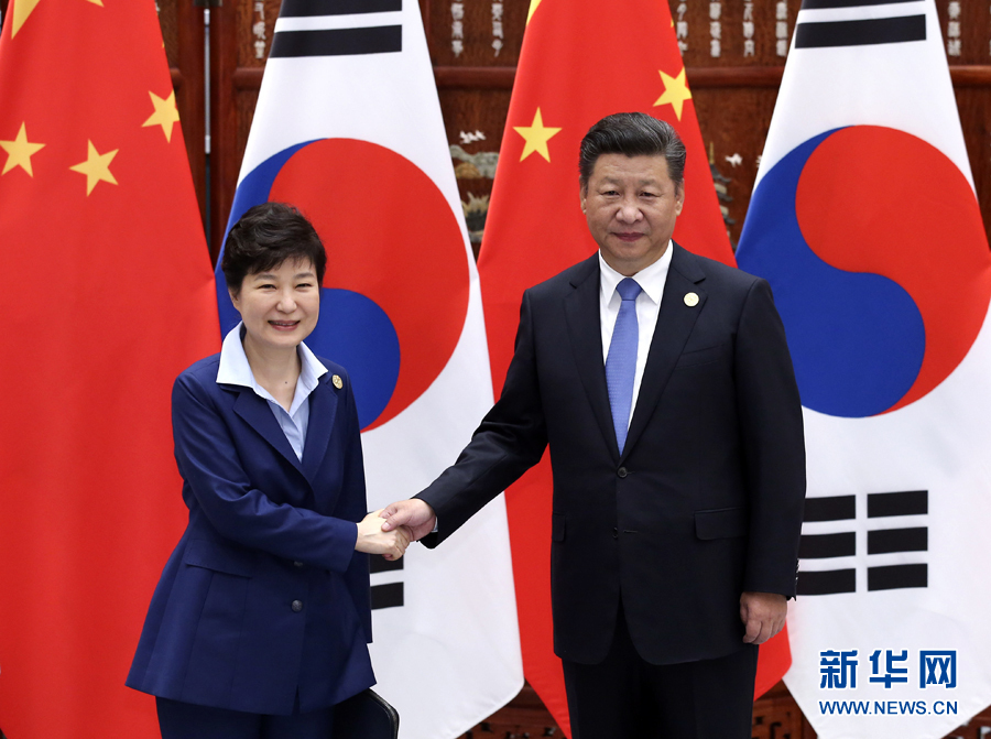 9月5日,國家主席習(xí)近平在杭州會(huì)見來華出席二十國集團(tuán)領(lǐng)導(dǎo)人峰會(huì)的韓國總統(tǒng)樸槿惠。 新華社記者龐興雷攝