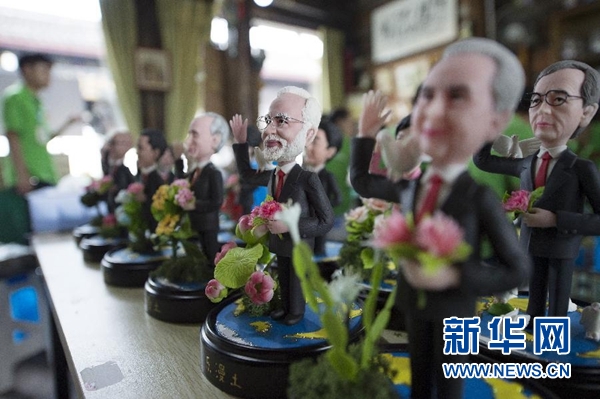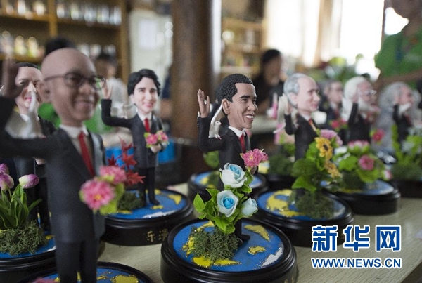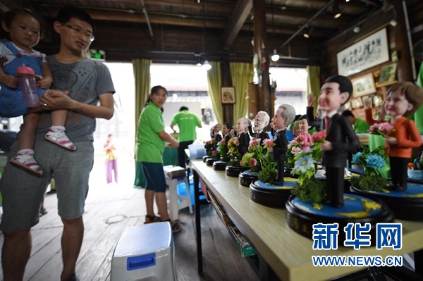 9月1日,手工藝人吳小莉創(chuàng)作的捏塑作品G20杭州峰會參會領(lǐng)導(dǎo)人形象在杭州京杭大運(yùn)河畔的橋西歷史街區(qū)擺放展示。新華社記者 鞠煥宗 攝