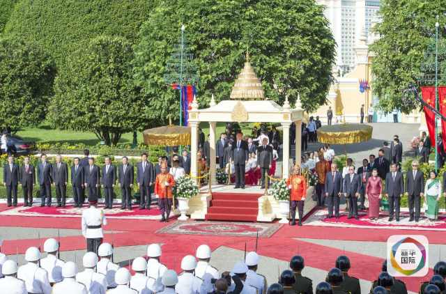 習(xí)近平出席西哈莫尼在王宮舉行的盛大歡迎儀式。(新華社記者王曄攝)
