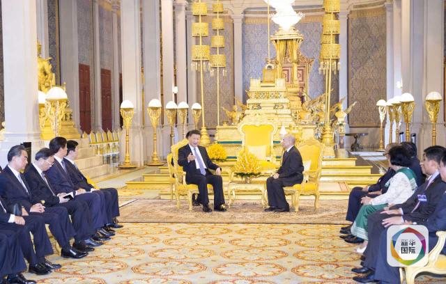 習(xí)近平在金邊會見柬埔寨國王西哈莫尼。(新華社記者謝環(huán)馳攝)
