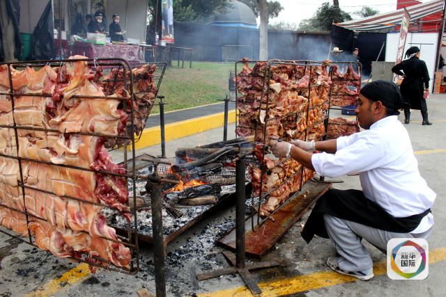 2015年6月20日,秘魯首都利馬舉行美食節(jié)。圖為一名廚師正在制作烤豬。(新華社發(fā) 路易斯·卡馬喬攝)