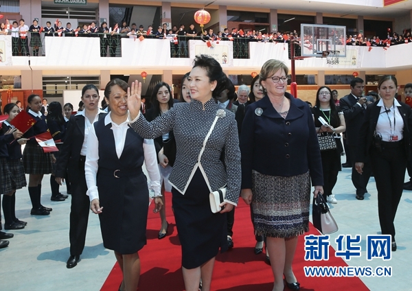 11月21日,國(guó)家主席習(xí)近平夫人彭麗媛在利馬參觀若望二十三世秘中學(xué)校。 新華社記者丁林?jǐn)z