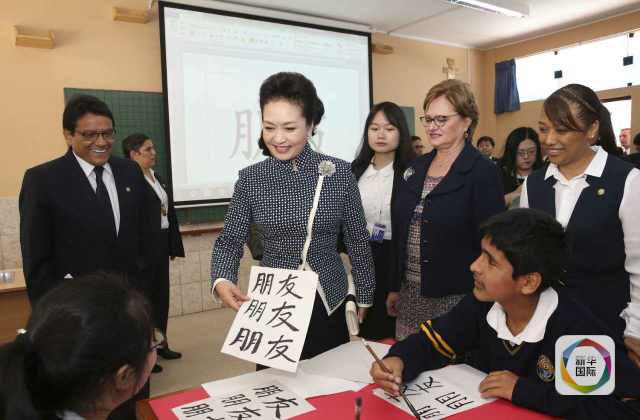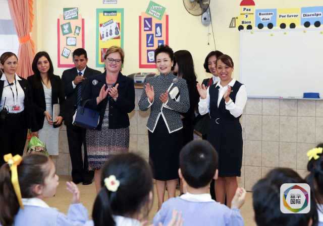 ??? 彭麗媛抵達時,秘魯總統(tǒng)夫人蘭格和學校校長在下車處迎接,校長為彭麗媛獻上鮮花。若望二十三世秘中學校創(chuàng)辦于1962年,是從幼兒園到中學教育的全日制學校,也是秘魯乃至南美洲最具影響的華文學校之一。