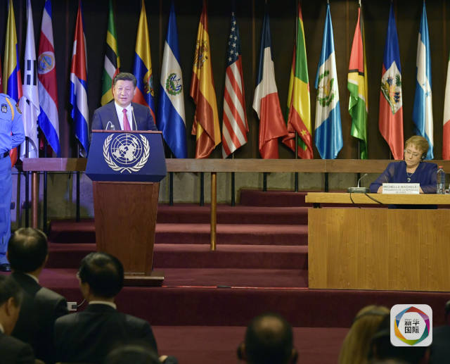 國家主席習(xí)近平在圣地亞哥聯(lián)合國拉丁美洲和加勒比經(jīng)濟委員會總部出席中拉媒體領(lǐng)袖峰會開幕式。智利總統(tǒng)巴切萊特陪同出席。在熱烈的掌聲中,習(xí)近平發(fā)表題為《開創(chuàng)中拉媒體合作新局面》的致辭。(新華社記者王曄攝)