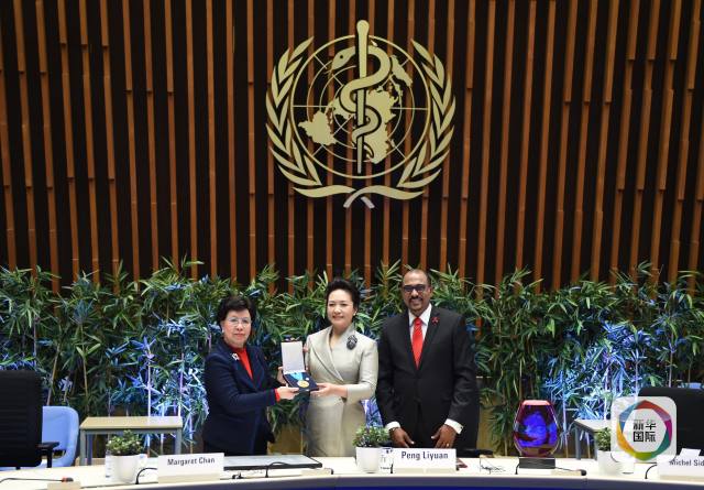 1月18日,國(guó)家主席習(xí)近平夫人、世界衛(wèi)生組織結(jié)核病和艾滋病防治親善大使彭麗媛應(yīng)世界衛(wèi)生組織總干事陳馮富珍和聯(lián)合國(guó)艾滋病規(guī)劃署執(zhí)行主任西迪貝邀請(qǐng),在瑞士日內(nèi)瓦出席為她舉行的親善大使任期續(xù)延暨頒獎(jiǎng)儀式。這是世界衛(wèi)生組織總干事陳馮富珍向彭麗媛頒發(fā)世衛(wèi)組織榮譽(yù)勛章。(新華社記者謝環(huán)馳攝)
