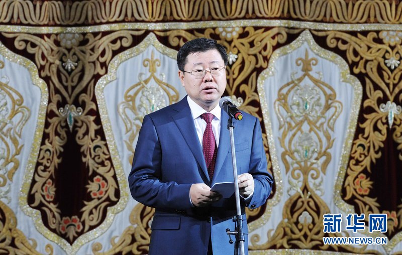? 1月18日晚,烏茲別克斯坦首都塔什干人民友誼宮,中國駐烏茲別克斯坦大使孫立杰在講話。新華網(wǎng)記者 沙達提 攝