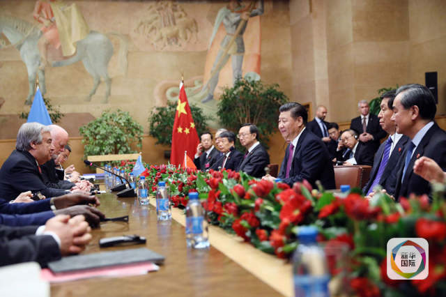 1月18日,國(guó)家主席習(xí)近平在瑞士日內(nèi)瓦萬(wàn)國(guó)宮會(huì)見第71屆聯(lián)合國(guó)大會(huì)主席湯姆森和聯(lián)合國(guó)秘書長(zhǎng)古特雷斯。(新華社記者蘭紅光攝)