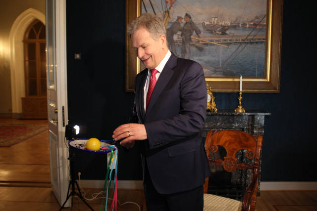 4月3日,赫爾辛基,芬蘭總統(tǒng)尼尼斯托看到新華社記者贈(zèng)送的太極柔力球高興得親自玩了幾下。(新華社記者張璇攝)