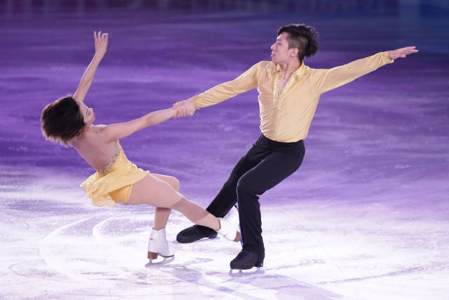 4月2日,中國(guó)選手隋文靜(左)/韓聰在表演中。當(dāng)日,2017花樣滑冰世錦賽在芬蘭赫爾辛基落幕。(新華社發(fā),馬蒂凱寧攝)