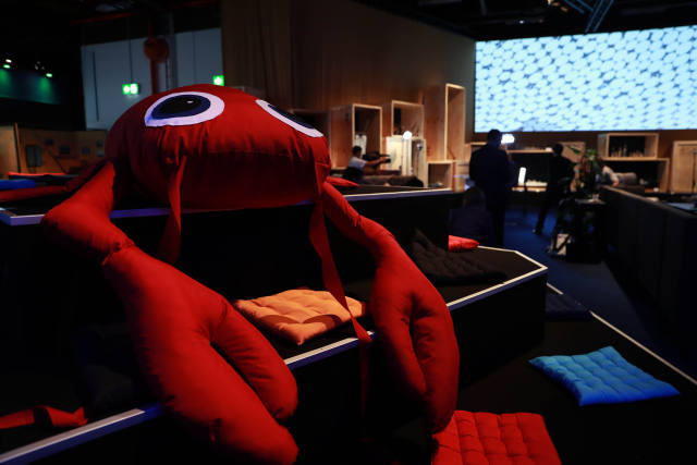 ↑這是7月6日在德國漢堡拍攝的G20領(lǐng)導(dǎo)人峰會(huì)國際新聞中心餐飲區(qū)擺放的螃蟹造型玩偶。新華社記者羅歡歡攝