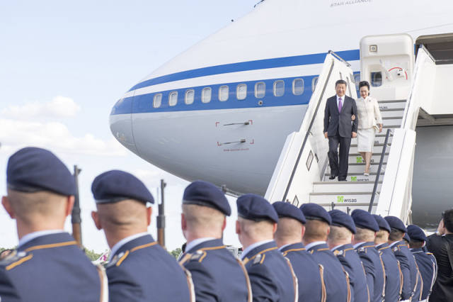 專機進入德國領空,兩架德國空軍戰(zhàn)機升空護航。專機抵達柏林,習近平主席和夫人彭麗媛步出艙門,現(xiàn)場鳴21響禮炮,戰(zhàn)機在空中飛越致意。