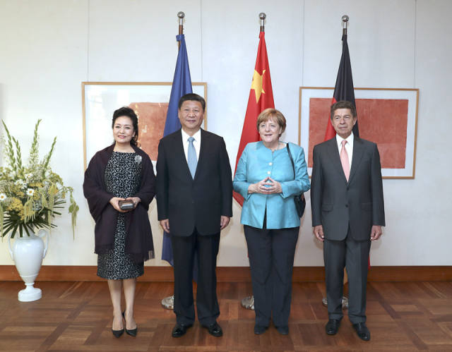 當?shù)貢r間7月4日晚,剛剛抵達柏林的國家主席習近平在利伯曼故居同德國總理默克爾舉行會見。這是習近平和夫人彭麗媛抵達位于柏林市中心勃蘭登堡門附近的利伯曼故居時,受到默克爾和丈夫紹爾熱情迎接。(新華社記者馬占成攝)