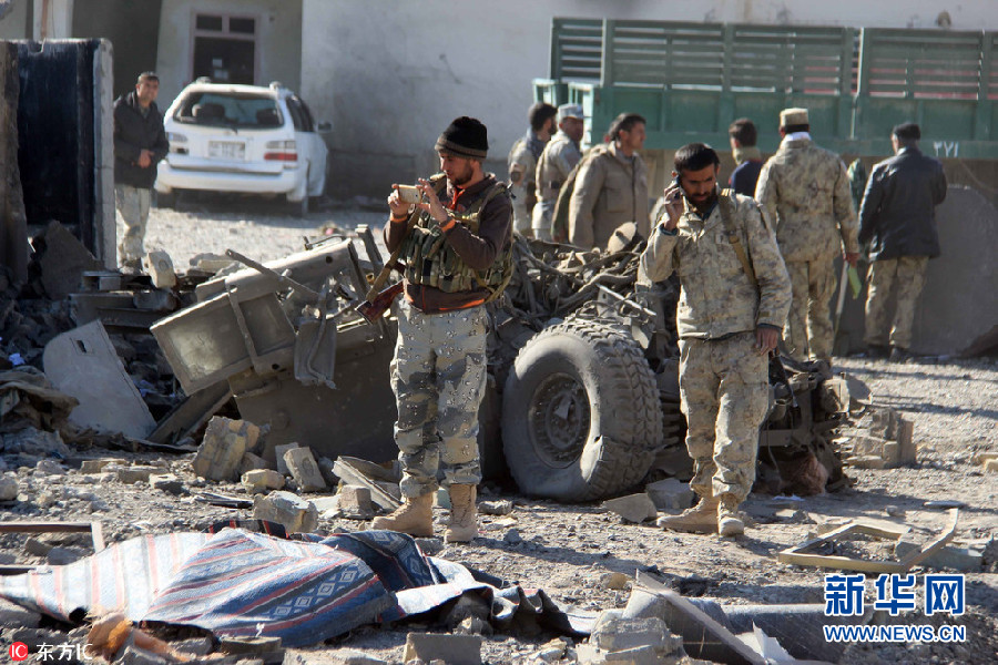 當?shù)貢r間22日,阿富汗坎大哈,當?shù)匾惶幘炜偛吭庥鲎詺⑹狡囌◤椧u擊,造成至少6名警察死亡,4人受傷。圖為阿富汗安全官員檢查現(xiàn)場。(圖片來源:東方IC)