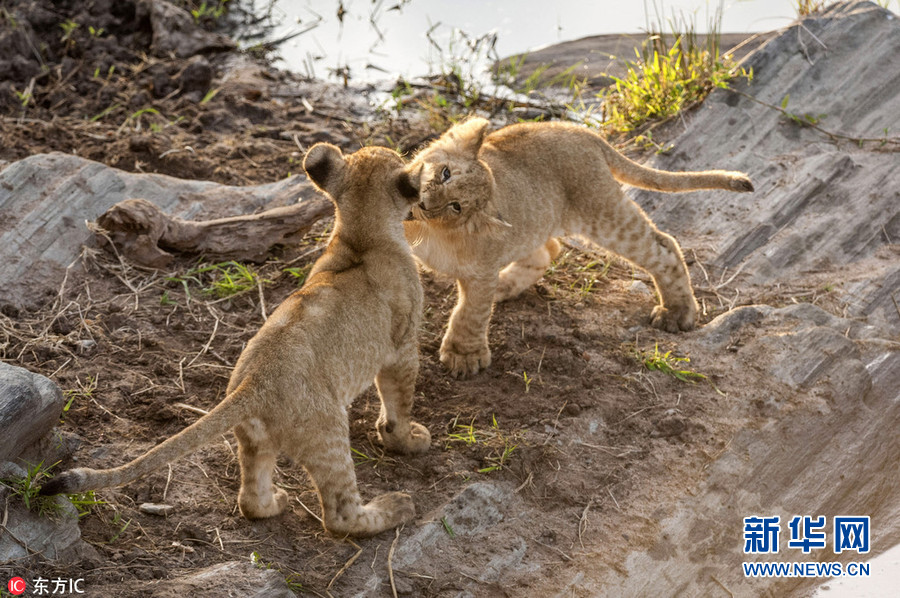 1月2日?qǐng)?bào)道(具體拍攝時(shí)間不詳),肯尼亞馬賽馬拉國(guó)家保護(hù)區(qū),64歲的攝影師Ingo Gelach在當(dāng)?shù)嘏臄z到一組有趣又暖心的照片。畫(huà)面中,兩頭小獅子站在水邊,似乎正考慮跨越面前的水域。其中一頭獅子用前腳搭在同伴的肩膀上,似乎在表達(dá)友好,又似是在鼓勵(lì)同伴不要害怕,勇敢地跨過(guò)去。(圖片來(lái)源:東方IC)