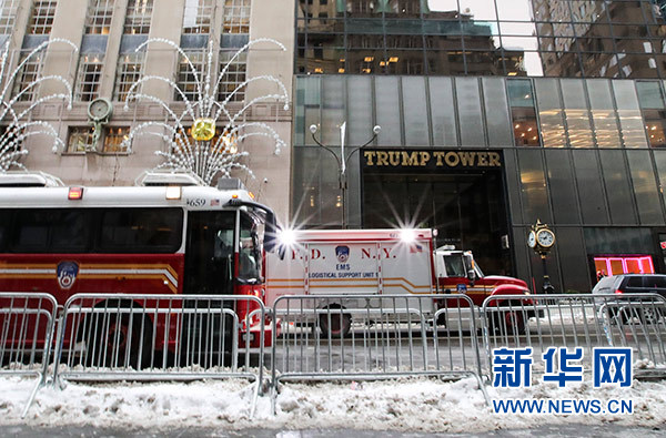 1月8日,消防車輛從美國(guó)紐約特朗普大廈外駛過(guò)。新華社記者 王迎 攝