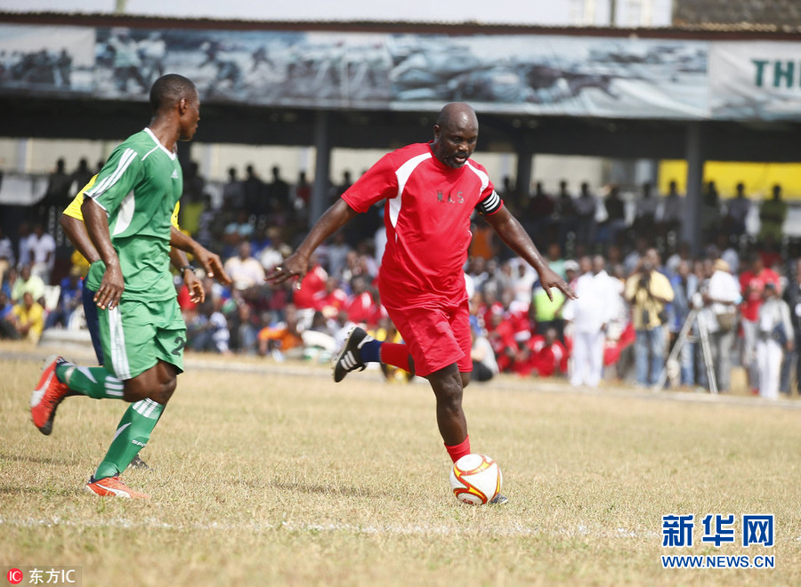 1月20日,利比里亞首都蒙羅維亞,利比里亞當(dāng)選總統(tǒng)、前世界足球先生喬治-維阿參加慈善足球比賽,率領(lǐng)維阿全明星隊(duì)對(duì)戰(zhàn)利比里亞武裝部隊(duì)士兵隊(duì)。喬治-維阿在去年12月27日當(dāng)選利比里亞新一任總統(tǒng),并將于2018年1月22日就職。(圖片來源:東方IC)