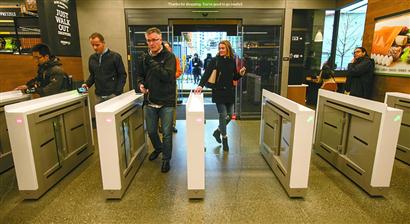 Amazon Go占地約167平方米,包括員工在內(nèi)可容納97人。進入店內(nèi)購物前,先要下載相關智能手機應用,并通過手機掃碼進入一個類似于地鐵站的閘機口。進入店內(nèi),首先映入眼簾的是可以直接食用的午餐食品,接著是肉類和餐具等雜貨。借助天花板上的大量黑色攝像頭和貨架上的重量傳感器,店方能探測何人取走了貨物。如果有人拿著商品走出閘門,其關聯(lián)賬號就會扣費。反之,如果消費者把商品放回貨架,商品則從虛擬購物車中刪除。顧客購物結束后直接通過閘機口離店,幾分鐘后將收到亞馬遜發(fā)送的電子收據(jù)。