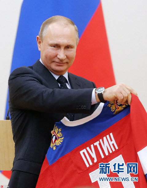 當(dāng)?shù)貢r(shí)間1月31日,俄羅斯莫斯科,普京會(huì)見征戰(zhàn)平昌冬奧會(huì)的俄羅斯運(yùn)動(dòng)員,獲俄冰球隊(duì)贈(zèng)送簽名球衣。(圖片來源:東方IC)