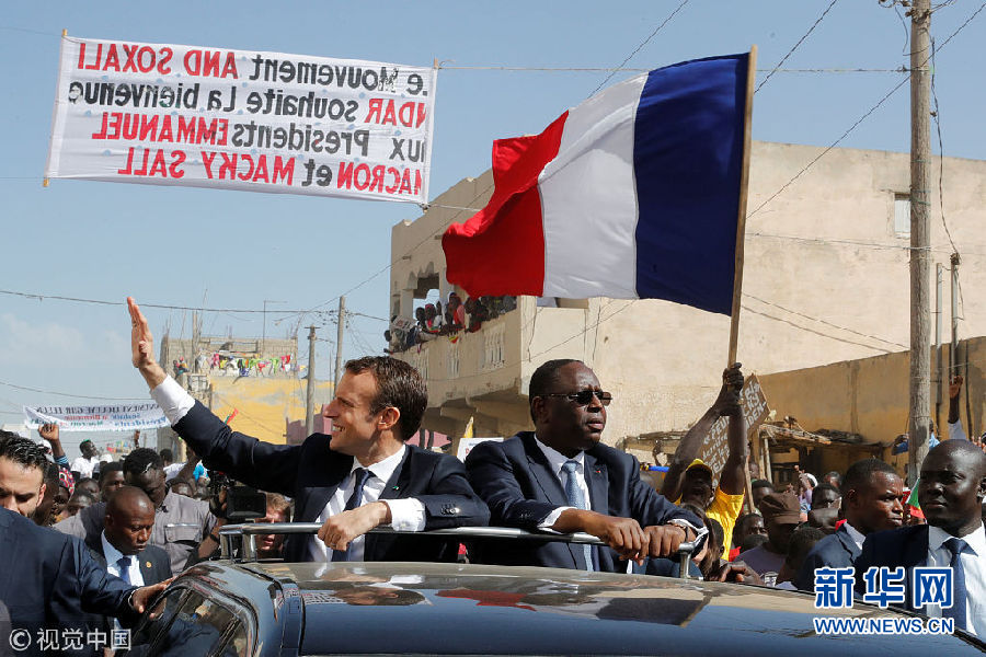 當(dāng)?shù)貢r(shí)間2月3日,塞內(nèi)加爾圣路易,塞內(nèi)加爾總統(tǒng)馬基·薩勒陪到訪(fǎng)的法國(guó)總統(tǒng)馬克龍?jiān)煸L(fǎng)當(dāng)?shù)?,兩人乘?chē)向民眾致意。(圖片來(lái)源:視覺(jué)中國(guó))