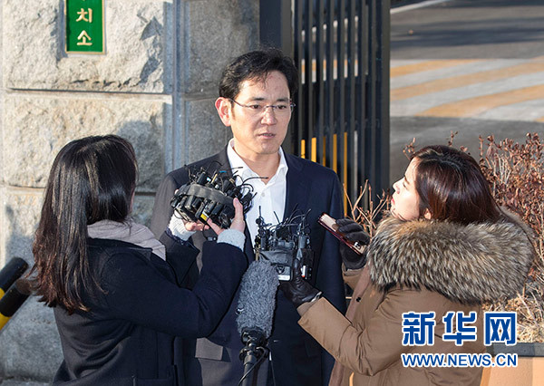 2月5日,韓國三星電子副會長李在镕(中)在位于韓國儀旺市的拘留所外接受記者采訪。新華社發(fā)(李相浩 攝)