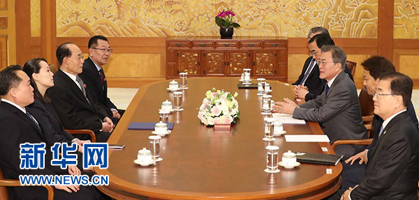 2月10日,在韓國首爾青瓦臺(tái),韓國總統(tǒng)文在寅(右三)會(huì)見由朝鮮最高人民會(huì)議常任委員會(huì)委員長金永南(左三)率領(lǐng)的朝鮮高級別代表團(tuán)。新華社/紐西斯通訊社