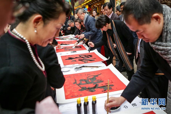 2月11日,在日本橫濱,書(shū)法家在活動(dòng)現(xiàn)場(chǎng)寫(xiě)“?!弊?。新華社記者馬曹冉攝
