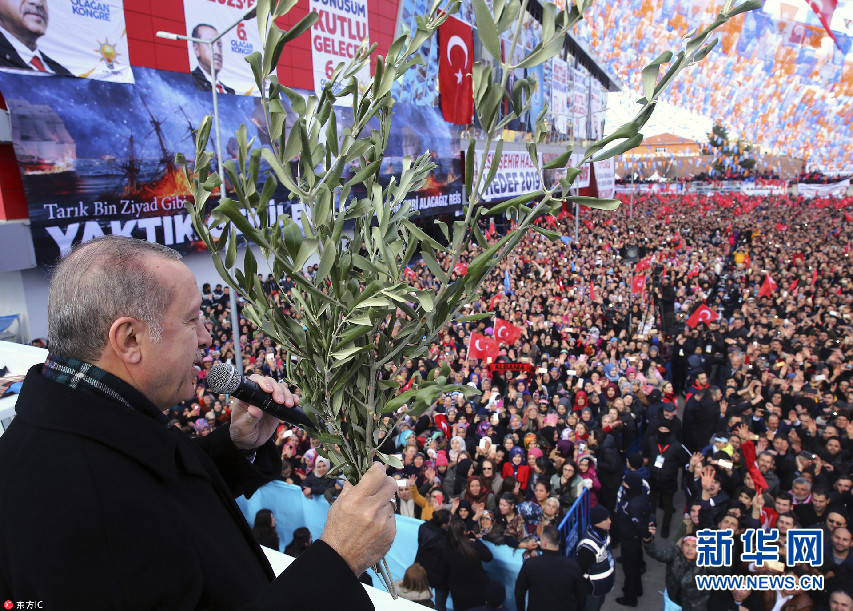 當?shù)貢r間2018年2月17日,土耳其埃斯基謝希爾,土耳其總統(tǒng)埃爾多安出席正義與發(fā)展黨集會,手持橄欖枝發(fā)表講話。(圖片來源:東方IC)
